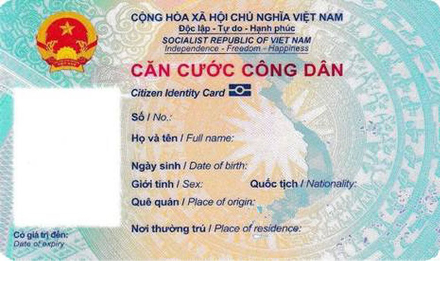 - Bên phải, từ trên xuống có các thông tin: CỘNG HÒA XÃ HỘI CHỦ NGHĨA VIỆT NAM; Độc lập - Tự do - Hạnh phúc; SOCIALIST REPUBLIC OF VIET NAM; Independence - Freedom - Happiness; dòng chữ CĂN CƯỚC CÔNG DÂN/Citizen Identity Card; biểu tượng chíp; mã QR; Số/No; Họ và tên/Full name; Ngày sinh/Date of birth; Giới tính/Sex; Quốc tịch/Nationality; Quê quán/Place of origin; Nơi thường trú/Place of residence.