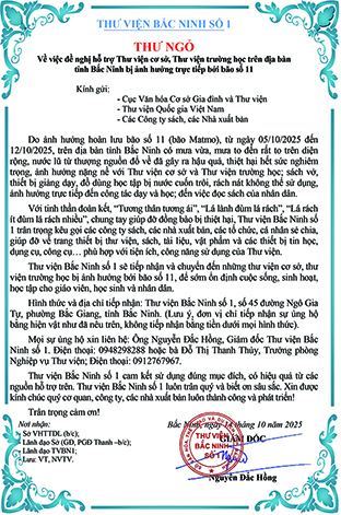 Theo đó, do ảnh hưởng hoàn lưu bão số 11 (bão Matmo), từ ngày 5/10 đến 12/10/2025, trên địa bàn tỉnh có mưa vừa, mưa to đến rất to trên diện rộng, nước lũ từ thượng nguồn đổ về đã gây ra hậu quả, thiệt hại hết sức nghiêm trọng, ảnh hưởng nặng nề với Thư viện cơ sở và Thư viện trường học. Sách vở, thiết bị giảng dạy, đồ dùng học tập bị nước cuốn trôi, rách nát không thể sử dụng, ảnh hưởng trực tiếp đến công tác dạy và học và đến việc đọc sách của nhân dân. Thư viện Bắc Ninh số 1 kêu gọi các công ty sách, các nhà xuất bản, các tổ chức, cá nhân sẻ chia, giúp đỡ về trang thiết bị thư viện, sách, tài liệu, vật phẩm và các thiết bị tin học, dụng cụ, công cụ… phù hợp với tiện ích, công năng sử dụng của thư viện (chỉ tiếp nhận sự ủng hộ bằng hiện vật, không tiếp nhận bằng tiền dưới mọi hình thức). Thư viện Bắc Ninh số 1 cam kết sử dụng đúng mục đích, có hiệu quả từ các nguồn hỗ trợ. Các trang thiết bị thư viện, sách, tài liệu, vật phẩm và các thiết bị tin học, dụng cụ, công cụ… sẽ được chuyển đến những thư viện cơ sở, thư viện trường học bị ảnh hưởng bởi bão số 11 ngay sau khi tiếp nhận.